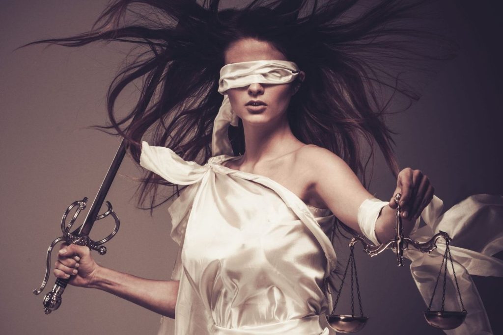 “Lady Justice” (Themis, Titaness of divine law and justice) is seen wearing a blindfold while holding a beam balance with a sword in her hand. The blindfold is a symbol of impartiality. She is an allegorical personification of the moral force in the judicial system.