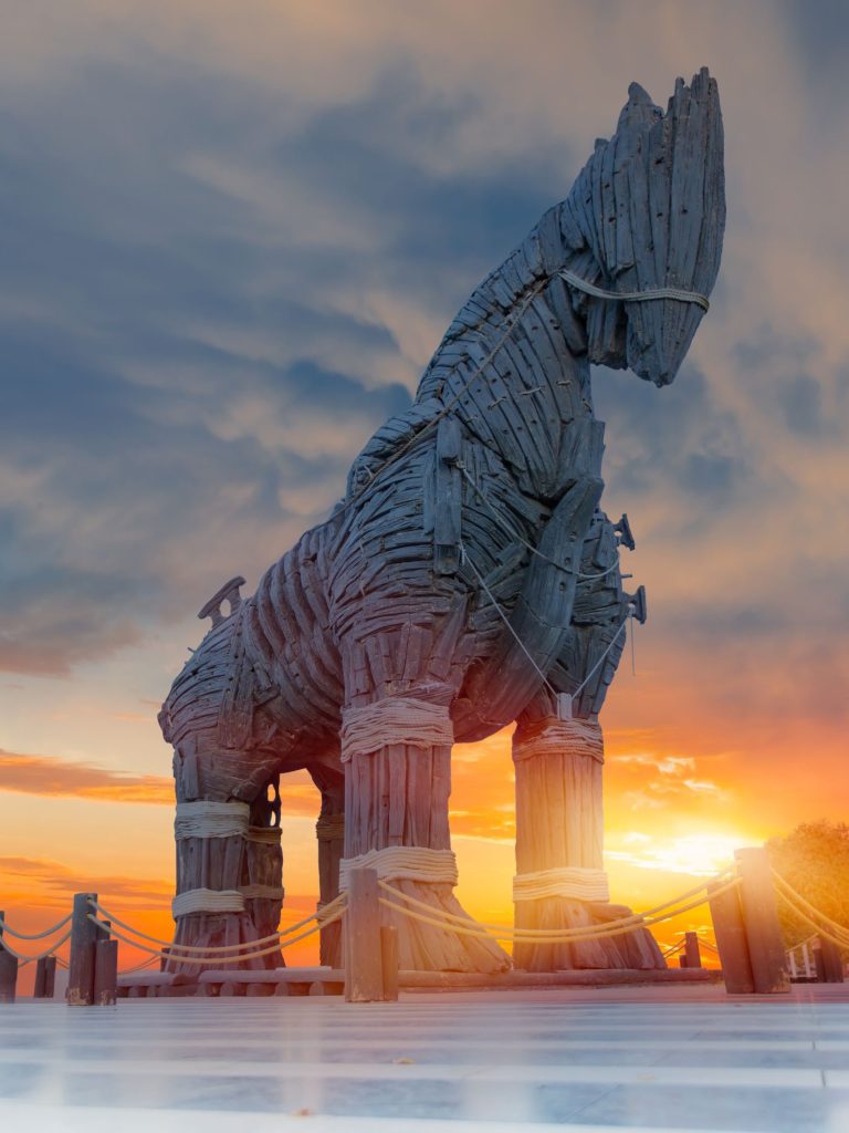 The Trojan horse stands outside the city gates a god-like marvel which offers protection and favour. The Trojans see no threat; the Greeks have fled. They invite it in, not knowing what lies within the belly of the beast. Who would not want to grant dictatorial powers to pious benefactors promising a utopian future – if you really believe it? (Link to “mask of piety”)